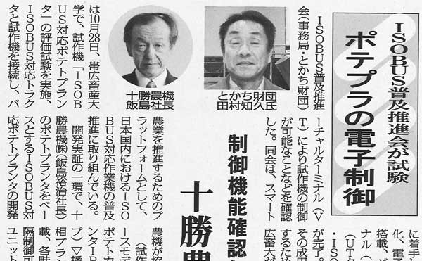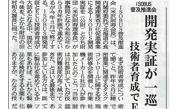 メディア掲載 2020-10-216274 ISOBUS普及推進会の取り組みが十勝毎日新聞に掲載されました #機械・電子注目 #十勝毎日新聞 #研究開発情報(機械・電子) #セミナー・人材育成(機械・電子) #地域連携