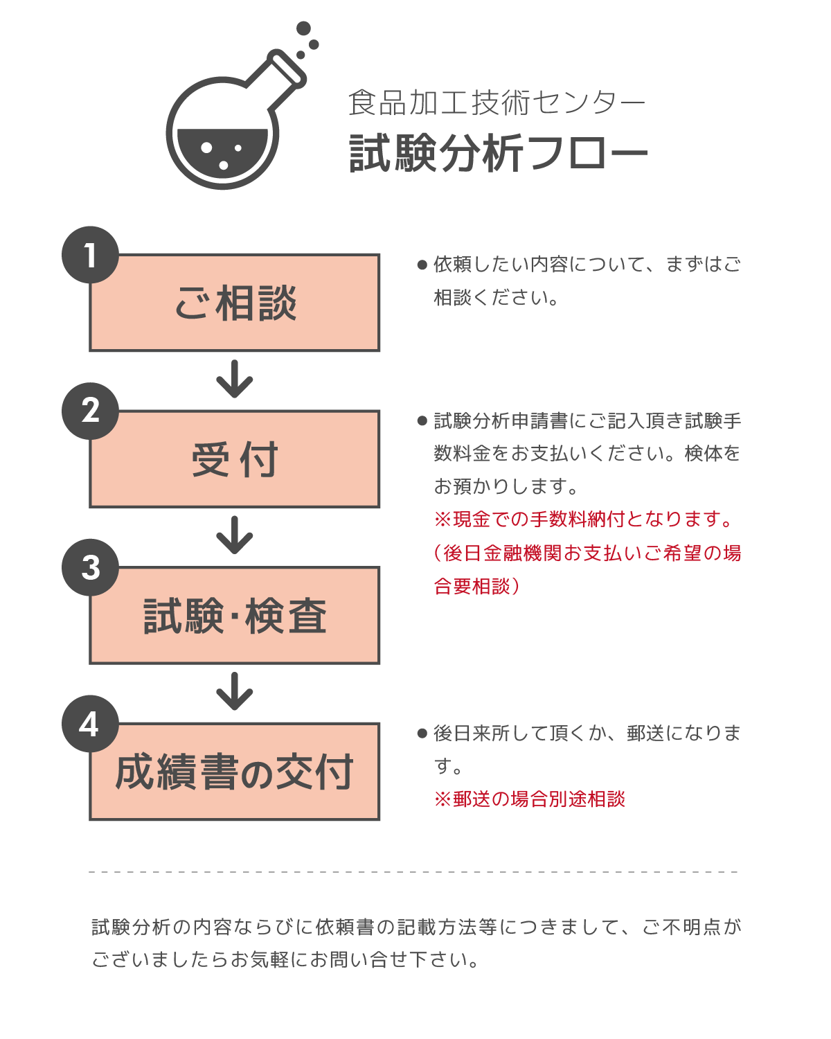 ご依頼の際は「試験分析依頼書」に必要事項を記載し、手数料(事前納付・現金徴収のみ)をご用意下さい。