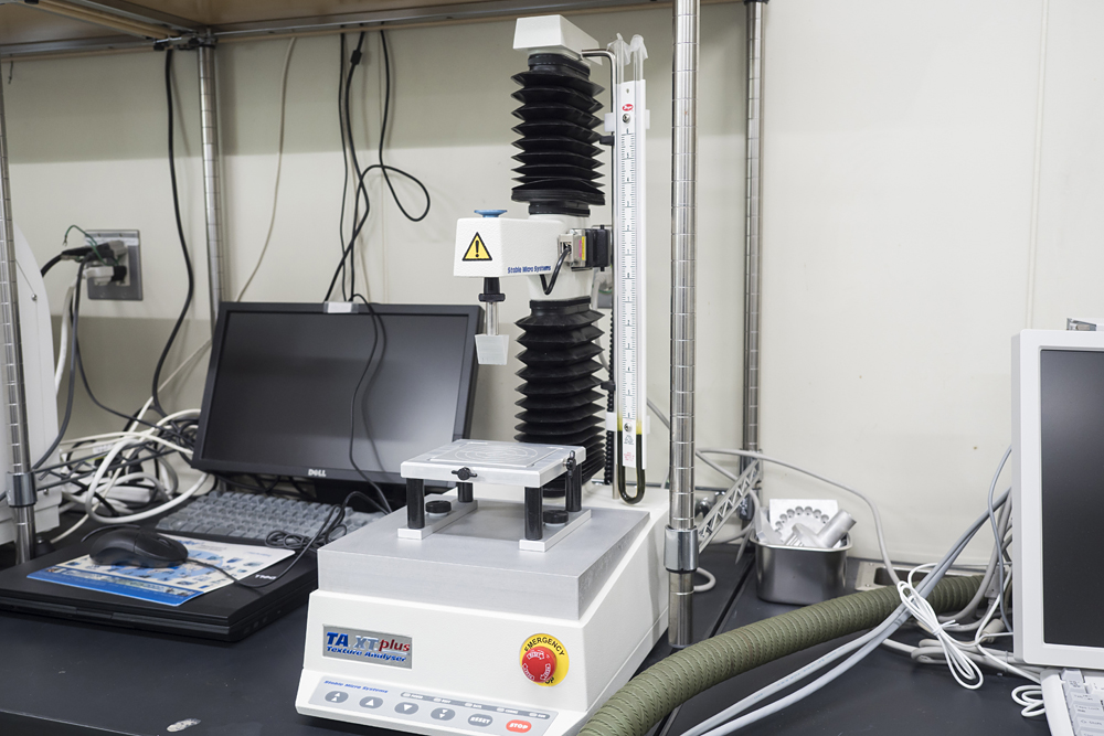 付属冶具により、潰す、突き刺す、引張するなどして、食品等の硬さや食感、引張性などを数値化する。